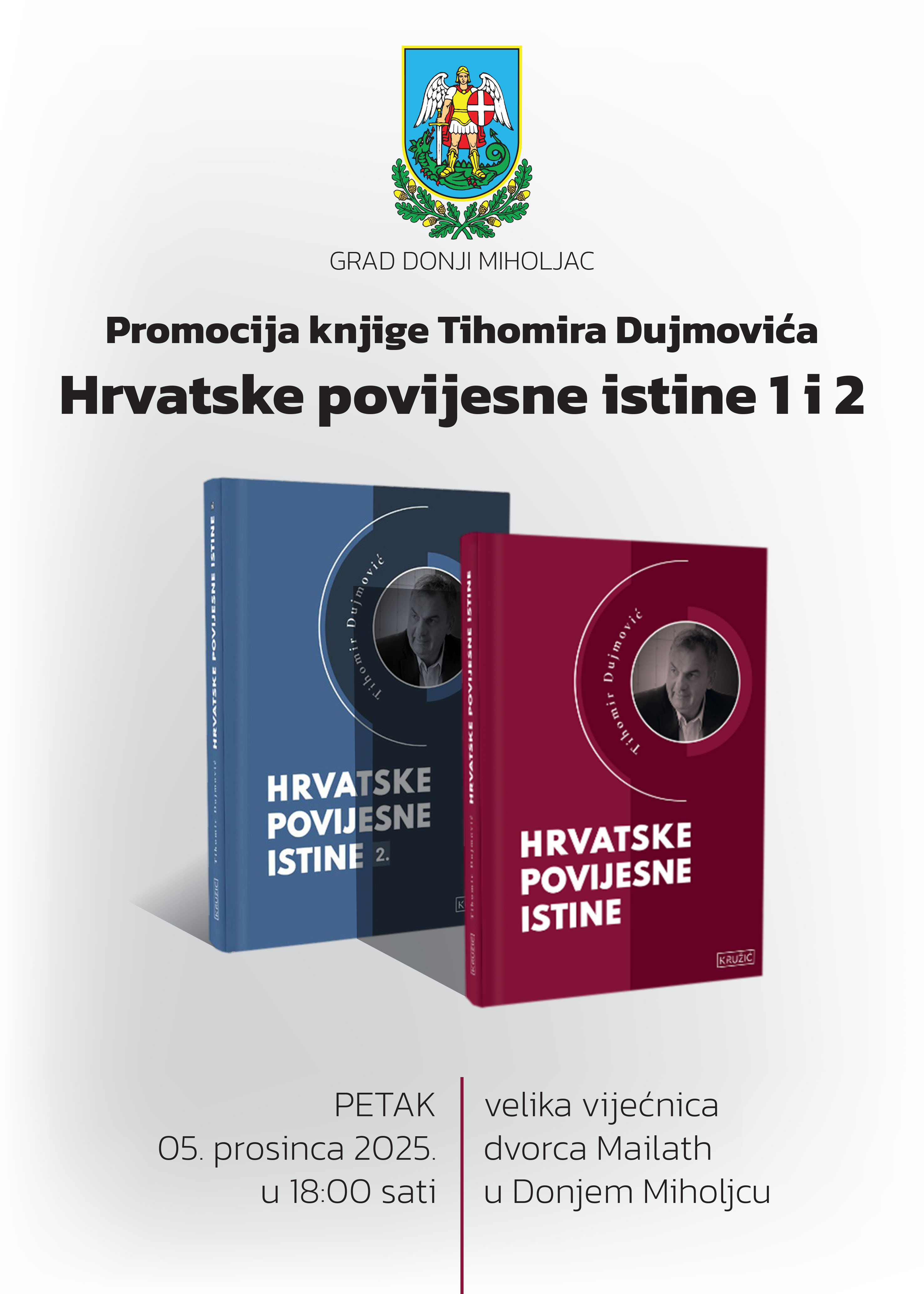 Grad Donji Miholjac poziva sve zainteresirane na promociju knjige Hrvatske povijesne istine 1 i 2 Tihomira Dujmovića koja će se održati u petak 5. prosinca 2025. godine u Velikoj vijećnici Grada Donjeg Miholjca.