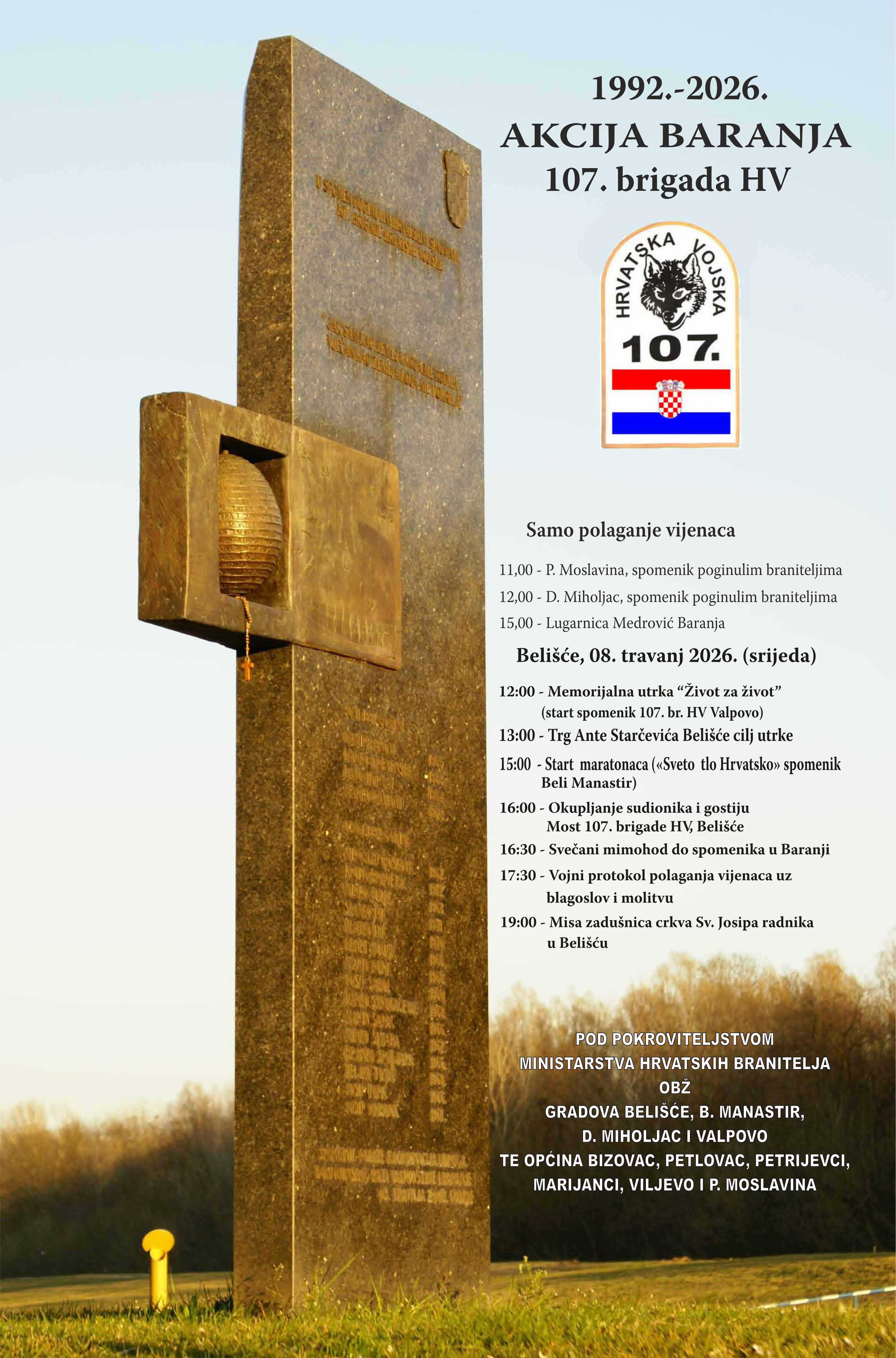 Pod pokroviteljstvom Ministarstva hrvatskih branitelja, Osječko-baranjske županije, gradova Belišće, Beli Manastir, Donji Miholjac i Valpovo te općina Bizovac, Petlovac, Petrijevci, Marijanci, Viljevo i Podravska Moslavina dana 8. travnja 2026. godine (srijeda) obilježit će se Akcija Baranja 107. brigade Hrvatske vojske.